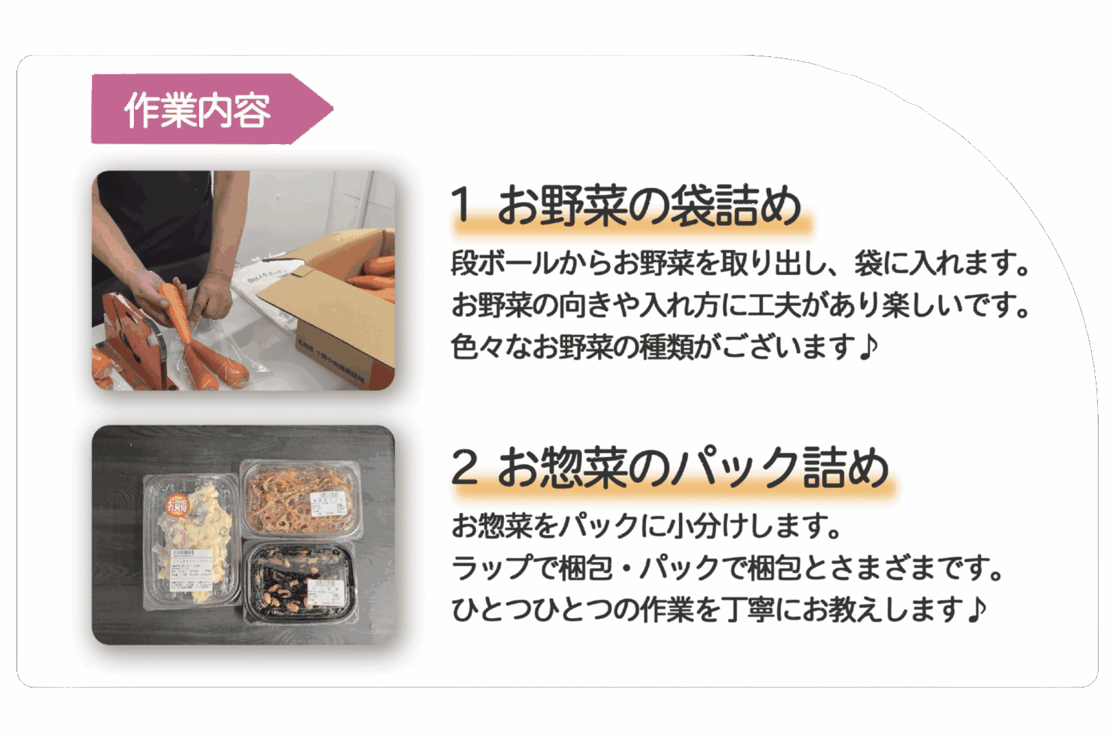 これまでパート従業員が行っていた野菜の袋詰めや惣菜の簡易加工といった軽作業を、利用者さんと共に担っていただきます。単に軽作業の場所を提供するだけでなく、働く意欲を持つすべての方々に対して生き生きと活躍できる「居場所」を創出することを目的としています。